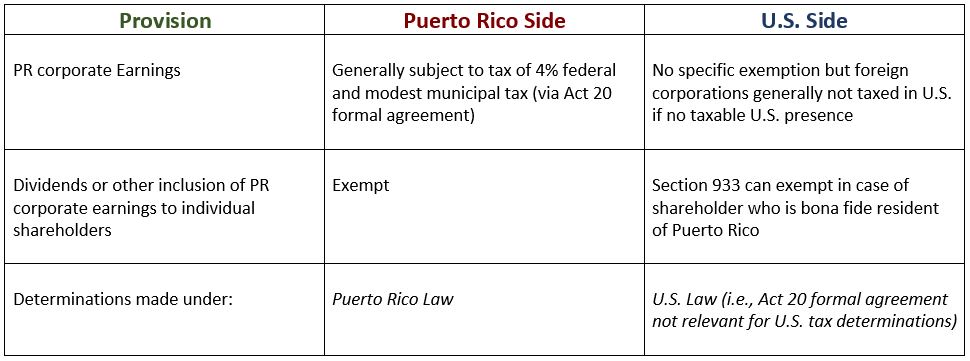 The specific U.S. tax incentive related to a Puerto Rico company applies when the earnings of such a company (i.e., dividends or accelerated U.S. tax inclusions) are treated as Puerto Rican source income that can be exempt from U.S. federal tax (under IRC §933). In order to qualify for this exemption, an individual shareholder must be treated as a resident in Puerto Rico under stringent “bona-fide” resident tests applied under U.S. tax law. In other words, if a U.S. citizen moves to Puerto Rico and establishes behaviors of residency similar to the doctor or taxi-driver, he or she can also claim the benefits of the exemption.