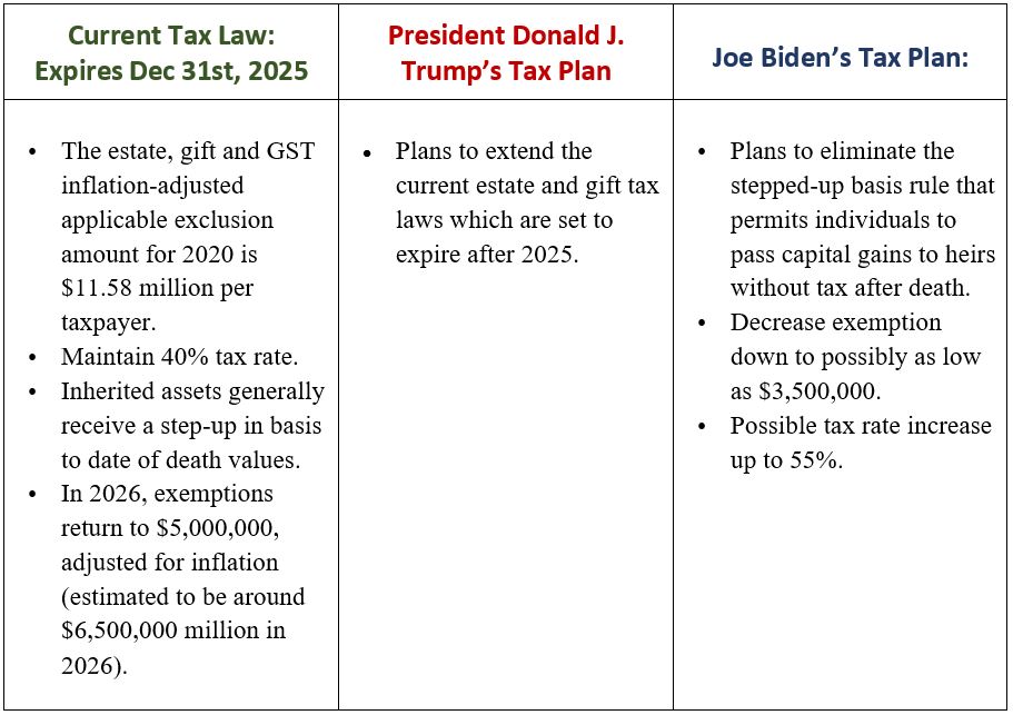 When examining these vastly different tax proposals, it is clear that there is a very real possibility that estate taxes could be significantly increased if Joe Biden and the Democratic party obtain control over Congress and the Presidency. If the tax proposals of Joe Biden are implemented and Congress makes any tax changes retroactive to January 2021, then millions of dollars of gifts could become nonexempt overnight. Decreasing the exemption from $11.58 million to between $5 million and $3.5 million, the elimination of stepped-up basis, and the increase of the tax rate applicable to taxable transfers all create a much more unfavorable tax climate for high net worth individuals. Tools that can be utilized to minimize transfer taxes for those who face them based on net worth include gifting the full exempt amount ($11.58 million) before the end of the year, potentially through the use of SLATs or dynasty trusts.