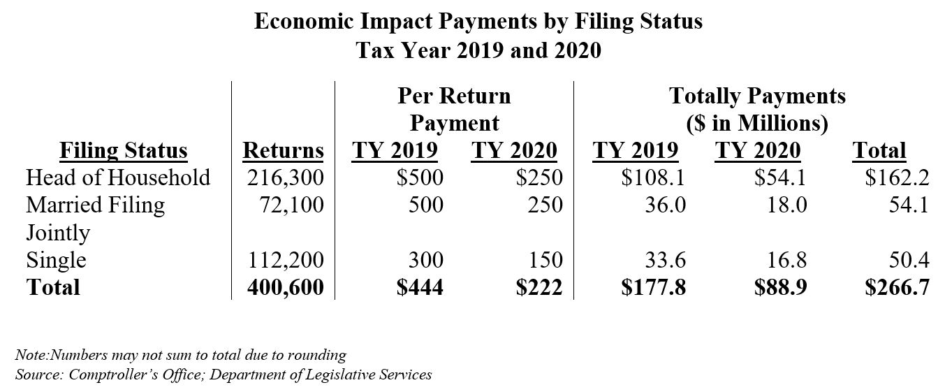 The Revised Fiscal and Policy Note shares the Department of Legislative Services’ tax years 2019 and 2020 economic impact payments visual aid, as follows:⁸